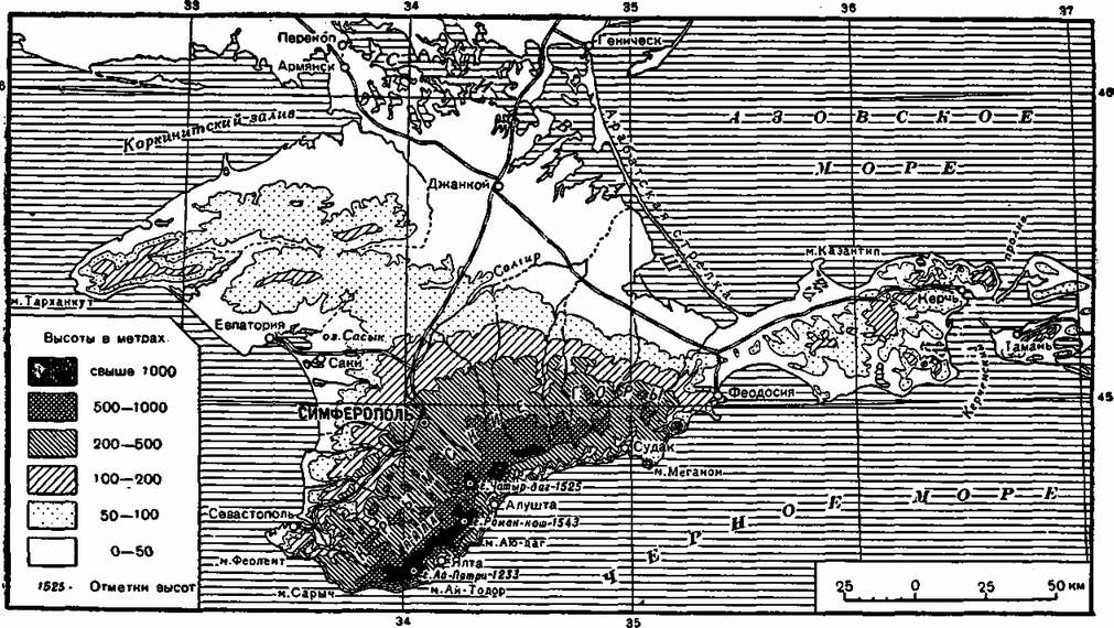 Начало этого процесса относится к мезозою. В течение юрского и мелового времени Крым был покрыт морем2. В море отложились мощные толщи осадочных пород — известняков, мергелей, песков и глин, позже подвергшихся складкообразованию и разломам. Поднятие Крыма началось с конца мелового периода. В середине третичного времени на месте Черного моря существовал обширный водный бассейн, простиравшийся далеко на восток в область современного Каспия. Весь Крым, за исключением первой горной гряды, и значительная часть территории Северного Кавказа тогда находились под водой. В третичное время происходили крупные дислокации в горном Крыму: древние структуры были раздроблены, смяты, рассечены сбросами и сдвигами.