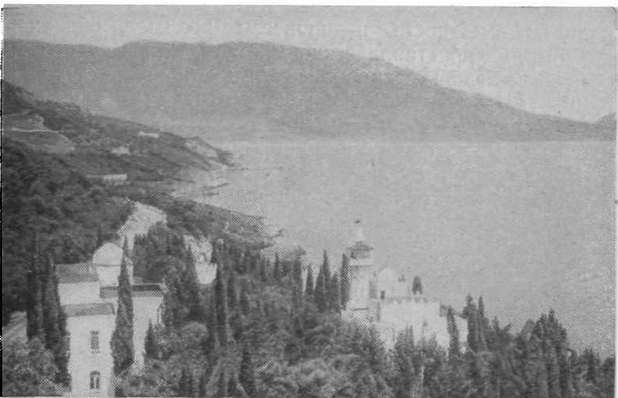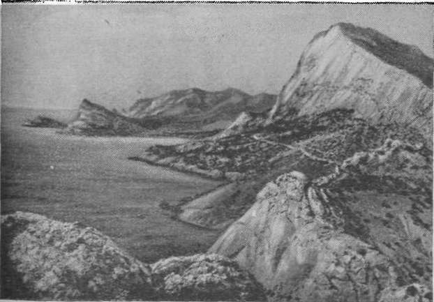 На Южном берегу и близ него много красивых скал. На снимке вид берега у Симеиза. Справа гора Кошка. Изогнутый хребет горы круто обрывается к морю отвесными скалами.